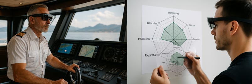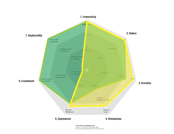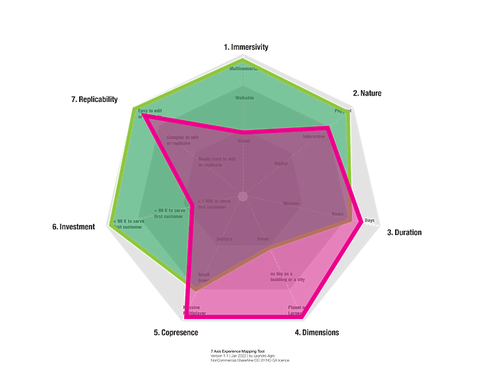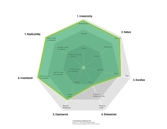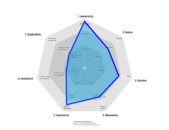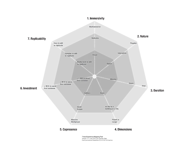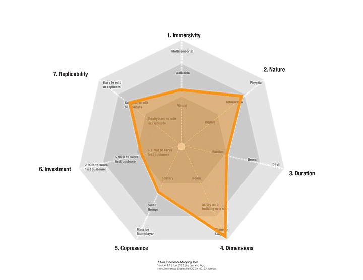 Each axis defines a critical aspect of an immersive experience. By plotting them, we can see its "shape," opening up conversations and comparisons. We can map a museum visit, a video game, a business meeting, or a theme park on the same canvas. That common language makes strategy and design actionable.